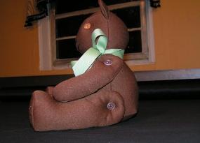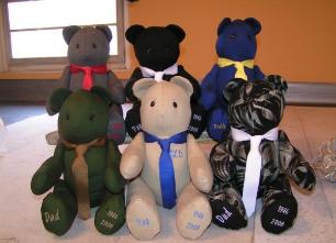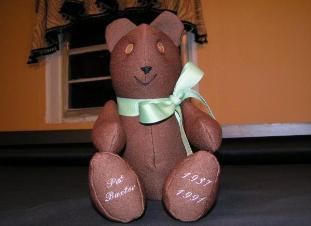 Memorial Bears Made out of your loved one's clothes, with there name and date embroider on there feet. With jointed arms and legs. Bows on the girls and ties on the boys. |