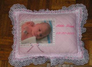 Newborn pillow E-mail us a picture and we will put it on a pillow for you with the name and birth date. |